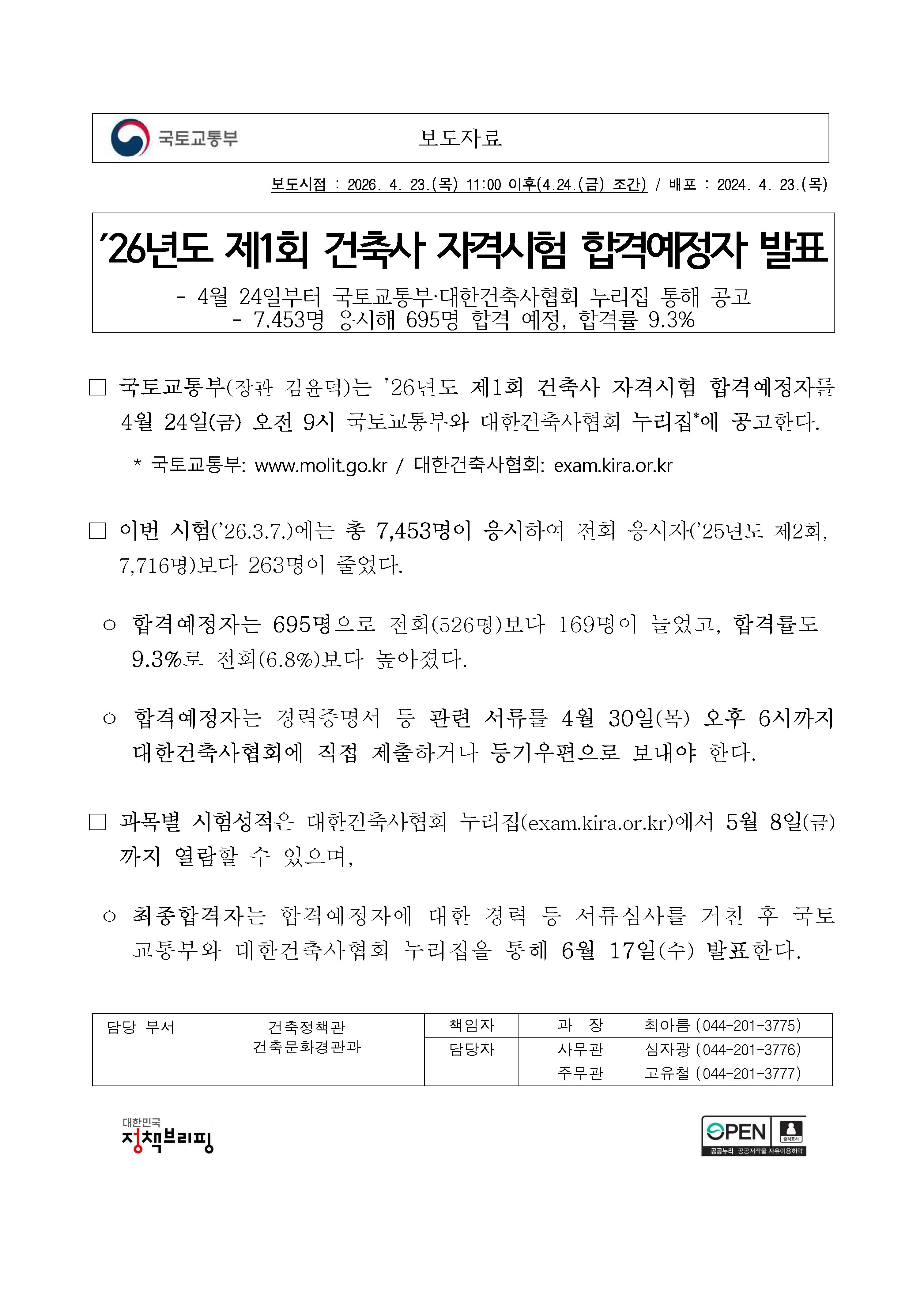 260424(조간) 26년도 제1회 건축사 자격시험 합격예정자 발표(건축문화경관과).pdf