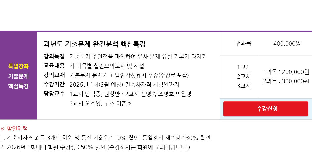 3교시 1과목:200,000원, 2과목:300,000원