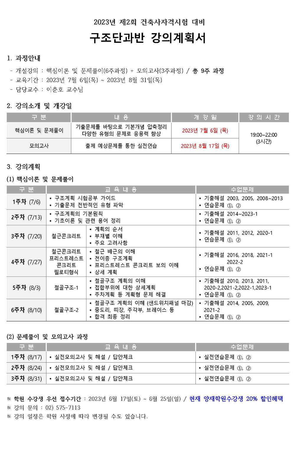 건축사자격 「구조단과반 특별과정」 학원강의 개강안내