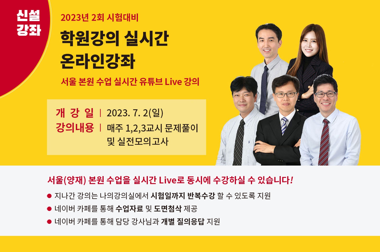 2023년 제2회 건축사자격시험을 대비하여 서울 본원수업을 Live로 수강하실 수 있는 특별강좌를 신설하였습니다.