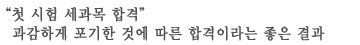 결코 혼자해서는 얻기 힘든 결과기에 한솔학원 선생님들과 관계자 분들께 다시 한 번 감사의 말씀을 전합니다. 그리고 묵묵히 저를 믿고 따라와 준 아내에게 고맙다는 말을 전하고 싶습니다, 또한 가장 중요한 것은 나 자신과의 싸움에서 나를 이겨야 한다는 것입니다. 1년이라는 시간이 길다면 길고 짧다면 짧을 수도 있지만 저는 제가 준비한 1년이라는 시간이 결코 긴 시간이 아니라고 말씀드리고 싶습니다.