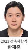 지원과 조언 없이 불가능했던 합격 저의 꾸준한 노력도 중요하지만 주변에서 지원이 없었다면 합격이 불가능했다고 생각합니다. 주변에 먼저 합격한 선배님들이 많은 격려를 해주셨고 어떻게 해야 효율적으로 작도할 수 있는지, 답안 작성할 때 필요한 팁들을 알려준 것이 많은 도움이 되었습니다. 또한 건축사 시험 준비를 다시 시작하게 되었을 때는 가족이 있었기 때문에 육아와 집안일을 외면할 수 없는 상황이었고, 공부에 전념하는 것은 어려웠습니다. 하지만 아내의 배려 덕분에 퇴근 후 저녁과 주말에 작도에 전념할 수 있었습니다. 이렇게 주변 격려와 서포트가 없었다면 저 또한 건축사에 합격할 수 없었다고 생각합니다. 한솔학원의 통신강의도 큰 도움이 되었습니다. 비록 본업과 집안일 때문에 현장강의를 들을 수 없었지만 양질의 강의와 기출 해설 덕분에 올바른 문제 풀이 프로세스를 체득할 수 있었습니다. 합격까지 도와주신 임덕종, 오호영 건축사님들께 감사의 말씀드리고 싶습니다.