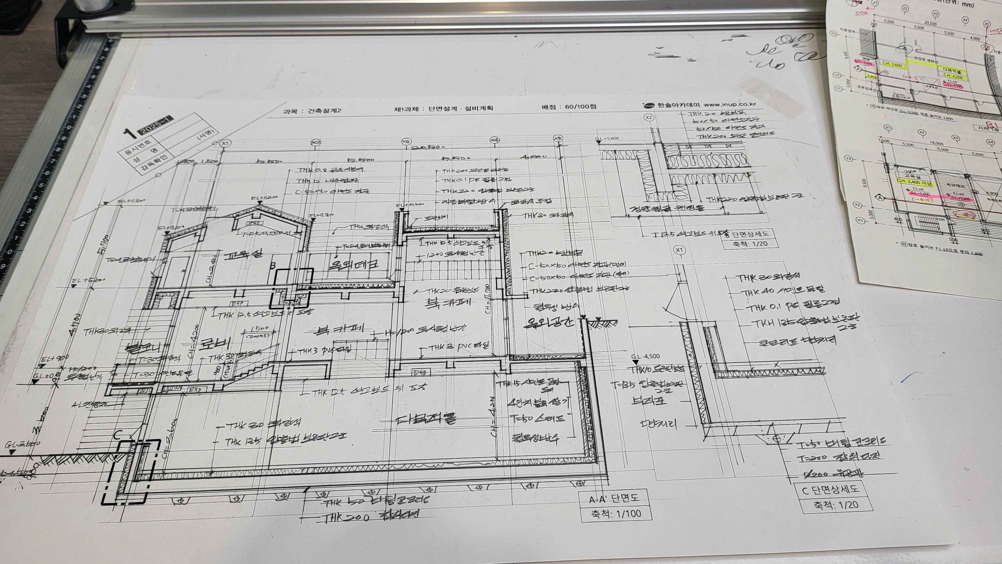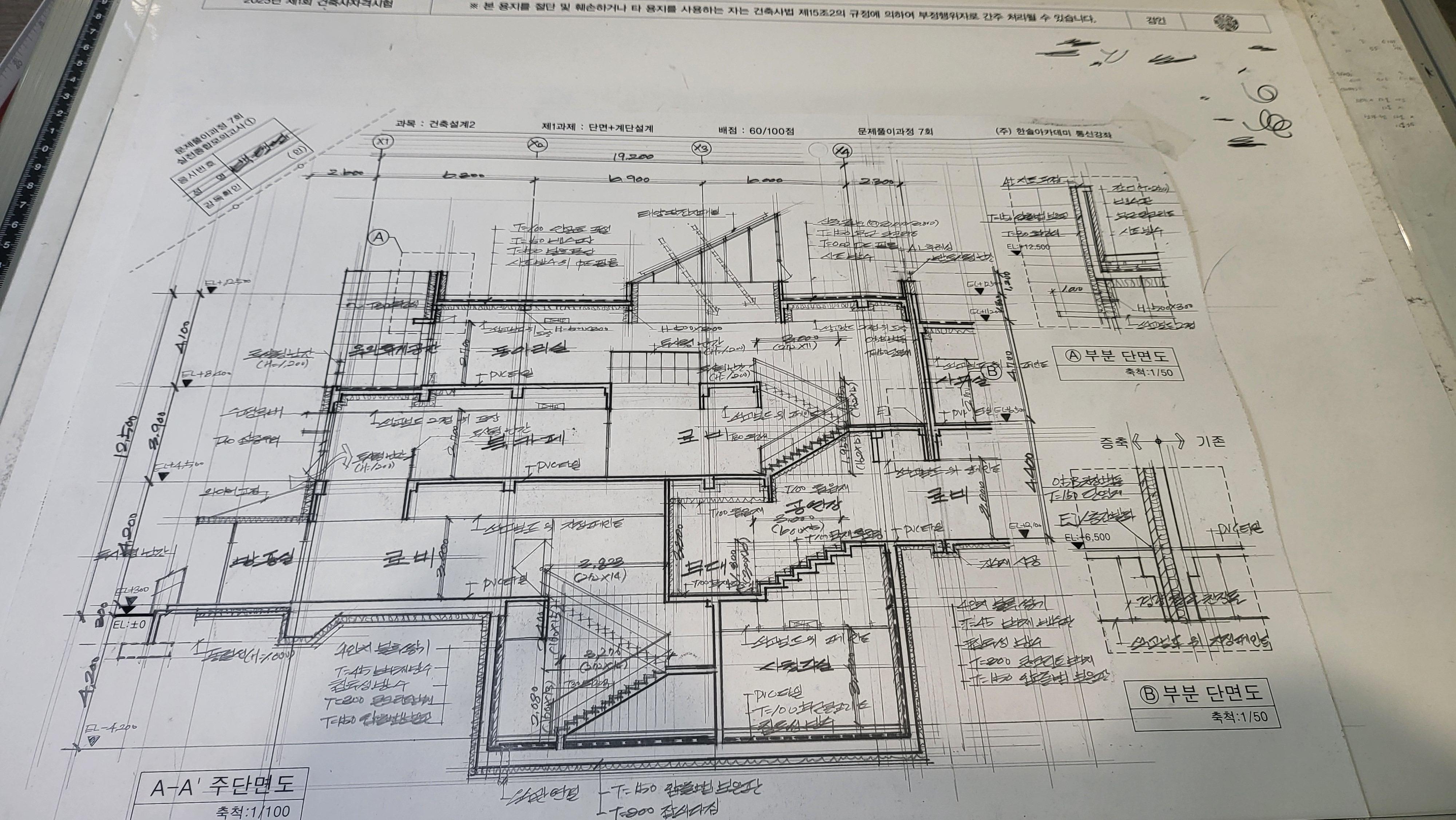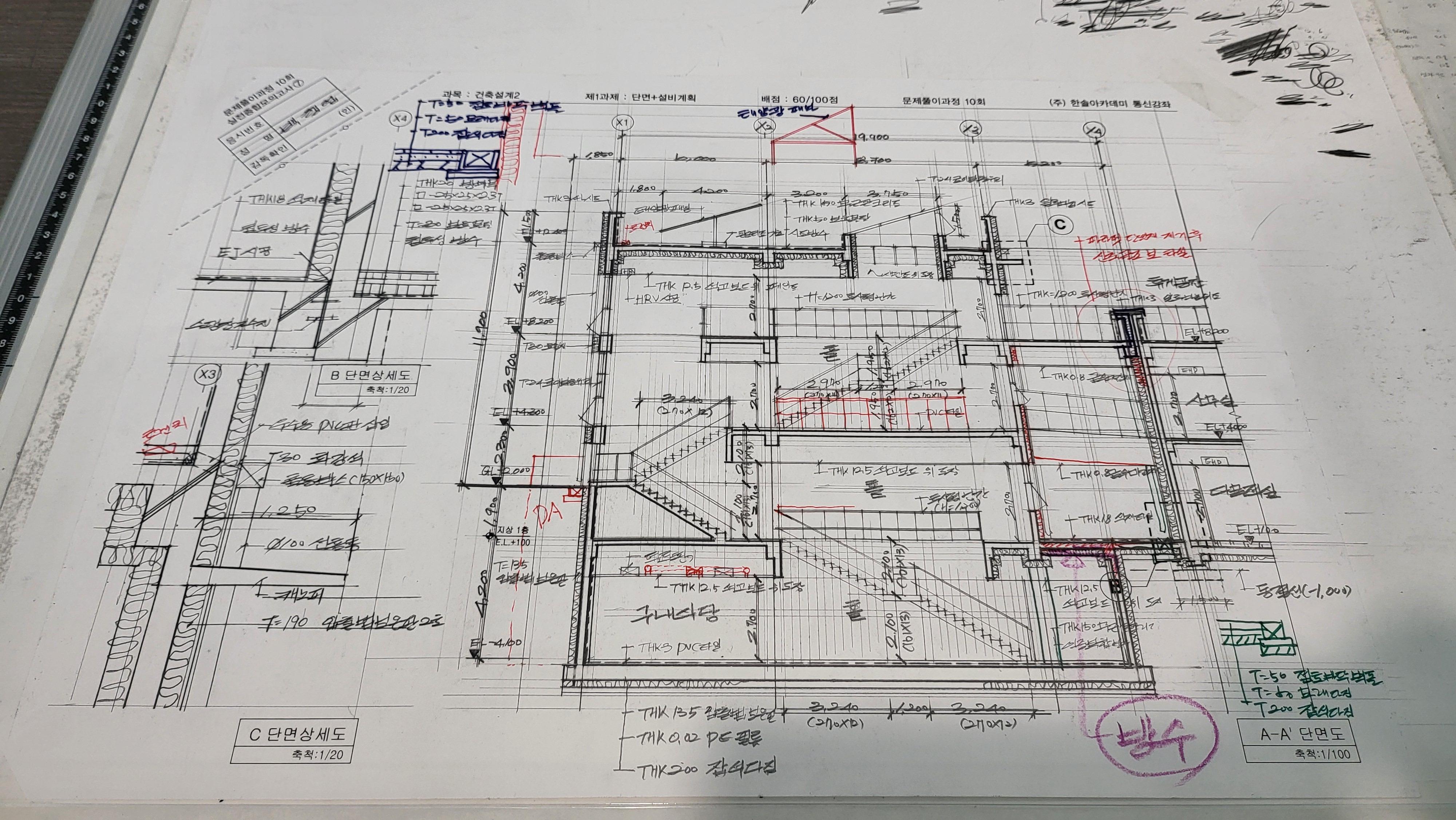 (단면설계) 대충 대충하는 성격을 버려야했습니다. 단순하게 도면만 이쁘고 깔금하고 마감자재명 등 작도량이 많다고 고득점을 받을 수 없었던거 같습니다. 단면 절취선을 기준으로 레벨, 입면, 마감 등에 대해 꼼꼼하게 체크하고 색깔별로 달리 표현해서 작도를 하였습니다. 오호영 교수님께서 가단면 없이 바로 작도하는 습관으로 진행하라고 말씀하셨는데, 저는 풀이하는데 너무 놓친게 많아서 사실 힘들었습니다. 처음 가단면을 트레싱지 위에 작도도면 스케일로 작도하다 조금씩 그 크기를 줄여갔습니다. 가단면에 표현할 내용을 조금씩 줄여 나갔습니다. 지속적인 연습의 연습을 통해 주먹만한 크기의 가단면을 완성할 수 있었고 가단면에도 색깔을 입혀서 본작도를 시작하였습니다. 저는 레벨를 파악해야하는 문제는 가단면 없이는 힘들었기에 문제를 보면서 가단면 량을 조절해 나갔습니다. 속도로 차츰 빨라지기 시작했고 마감재 기입시에는 일부 가선없이 프리핸드로 보조선을 추출하여 기입하였습니다. 작도가 약한 저는 타이머를 가지고 미친 듯 기계처럼 작도하는 연습을 많이 했습니다.