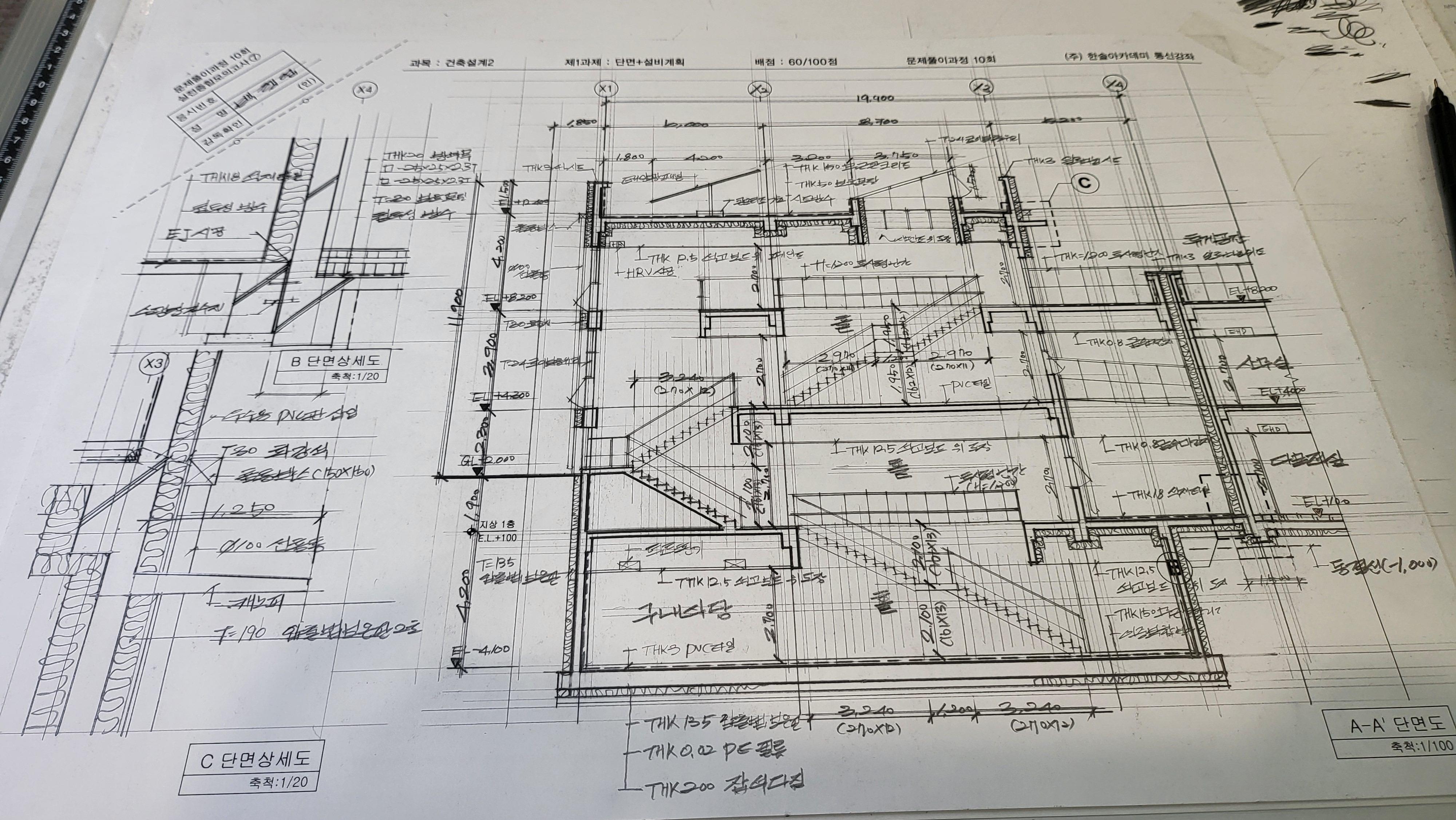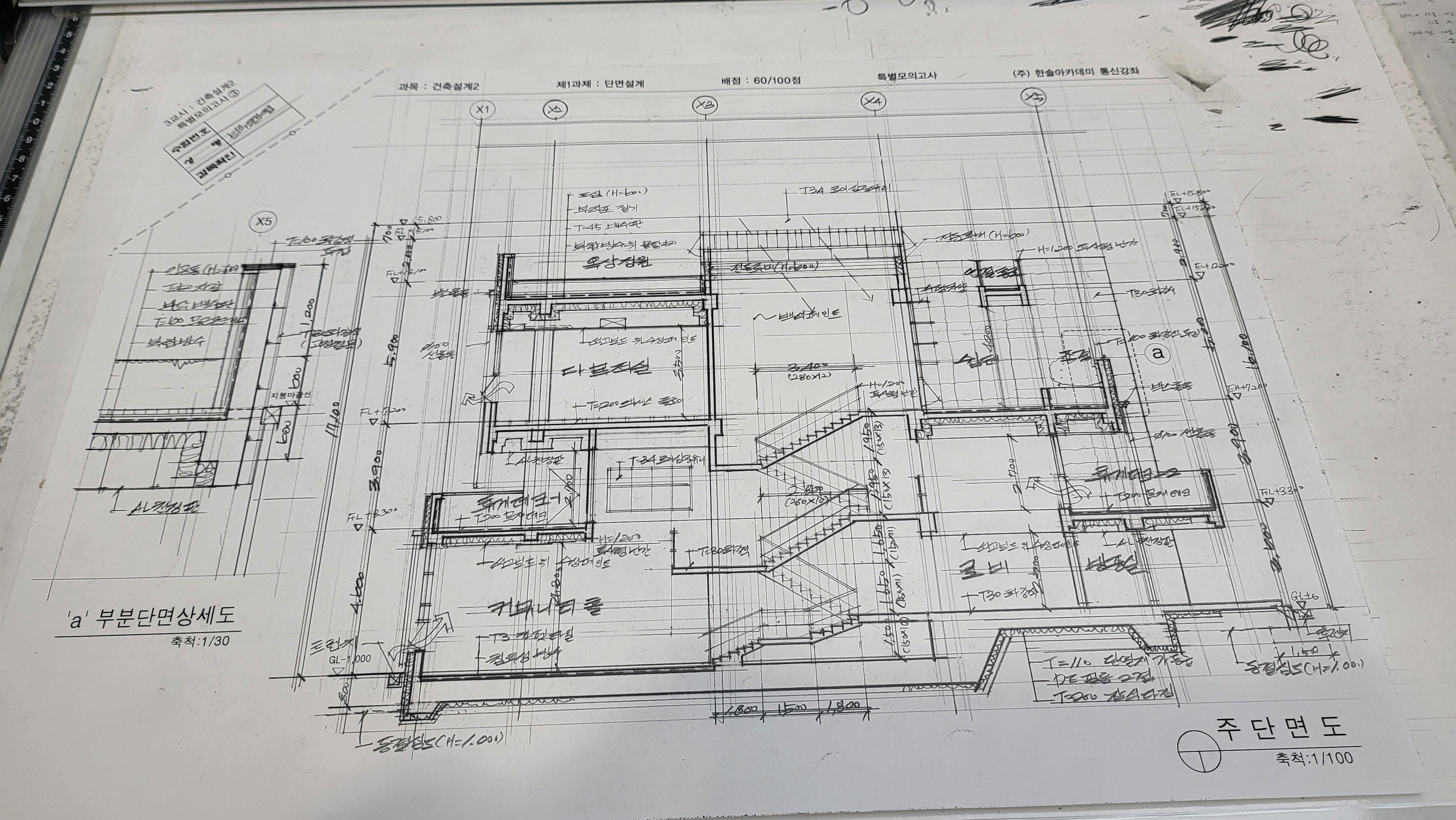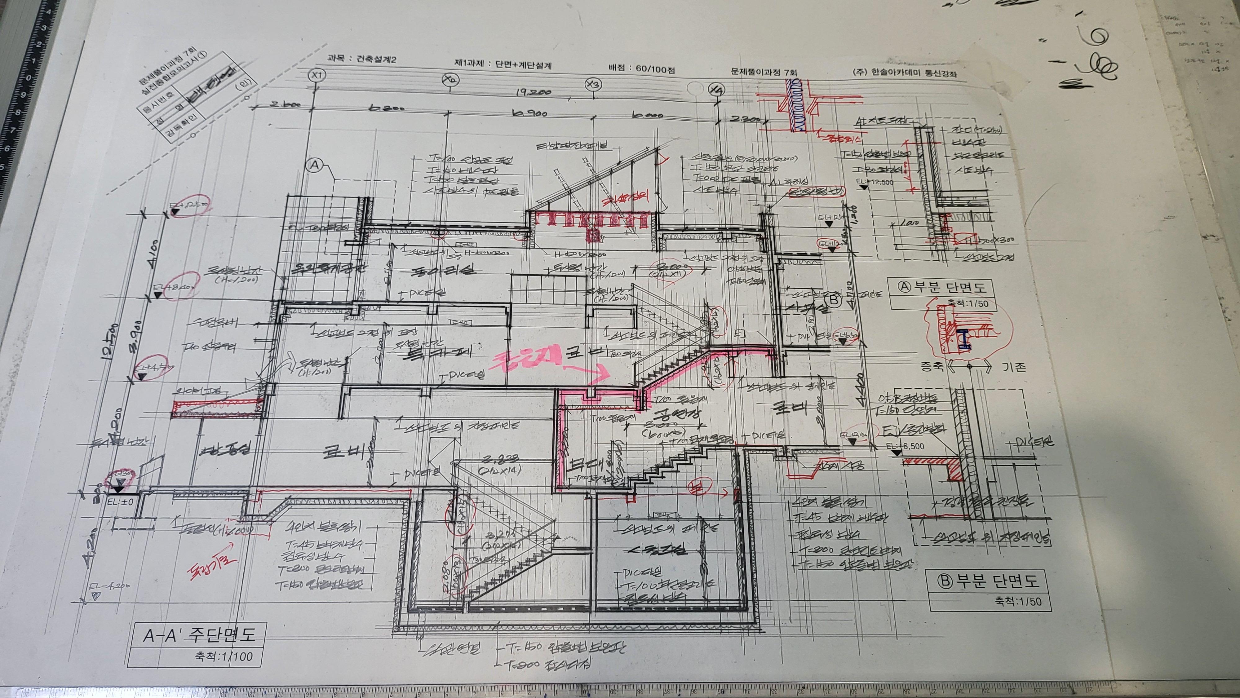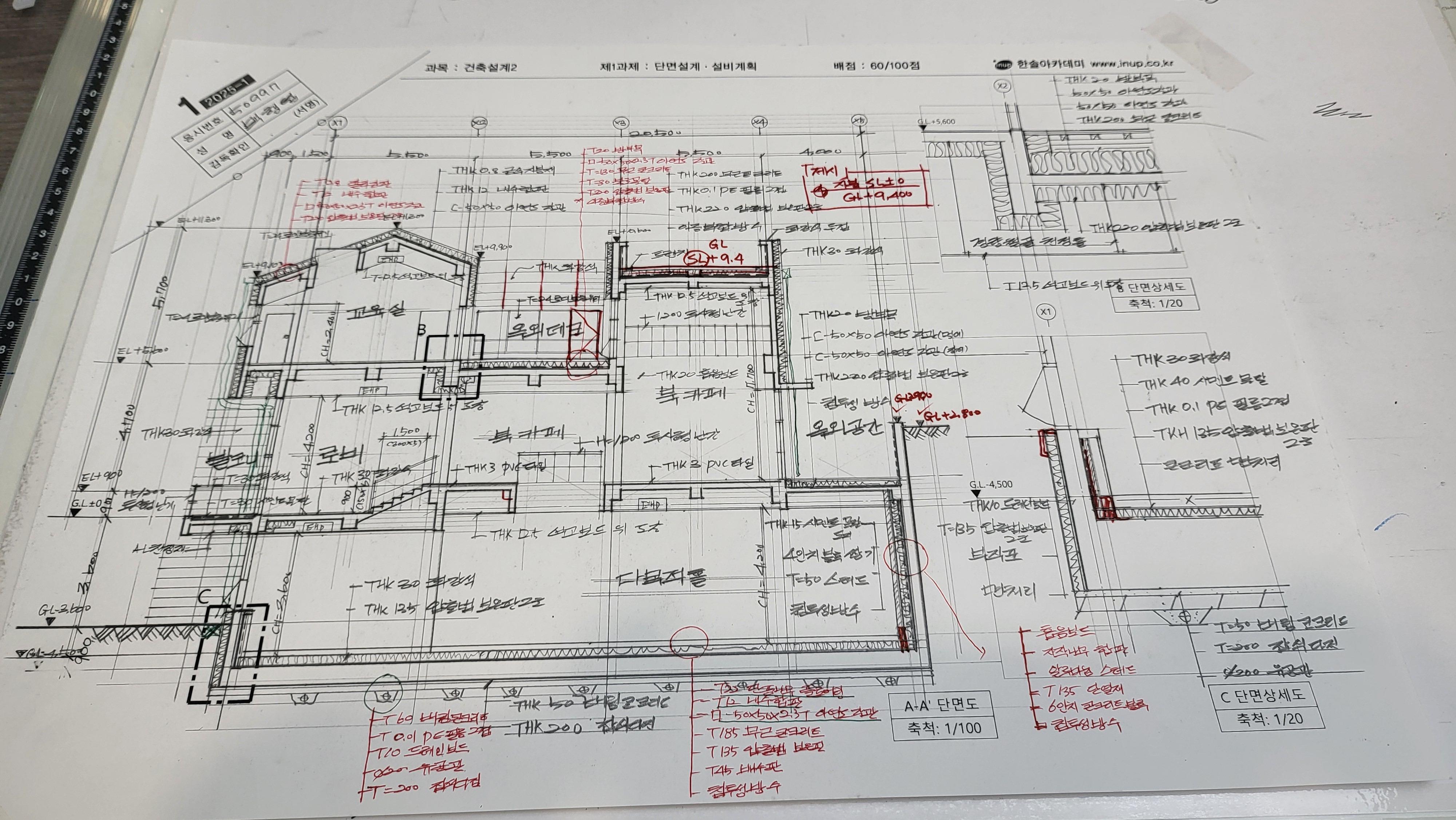 (단면설계) 대충 대충하는 성격을 버려야했습니다. 단순하게 도면만 이쁘고 깔금하고 마감자재명 등 작도량이 많다고 고득점을 받을 수 없었던거 같습니다. 단면 절취선을 기준으로 레벨, 입면, 마감 등에 대해 꼼꼼하게 체크하고 색깔별로 달리 표현해서 작도를 하였습니다. 오호영 교수님께서 가단면 없이 바로 작도하는 습관으로 진행하라고 말씀하셨는데, 저는 풀이하는데 너무 놓친게 많아서 사실 힘들었습니다. 처음 가단면을 트레싱지 위에 작도도면 스케일로 작도하다 조금씩 그 크기를 줄여갔습니다. 가단면에 표현할 내용을 조금씩 줄여 나갔습니다. 지속적인 연습의 연습을 통해 주먹만한 크기의 가단면을 완성할 수 있었고 가단면에도 색깔을 입혀서 본작도를 시작하였습니다. 저는 레벨를 파악해야하는 문제는 가단면 없이는 힘들었기에 문제를 보면서 가단면 량을 조절해 나갔습니다. 속도로 차츰 빨라지기 시작했고 마감재 기입시에는 일부 가선없이 프리핸드로 보조선을 추출하여 기입하였습니다. 작도가 약한 저는 타이머를 가지고 미친 듯 기계처럼 작도하는 연습을 많이 했습니다.